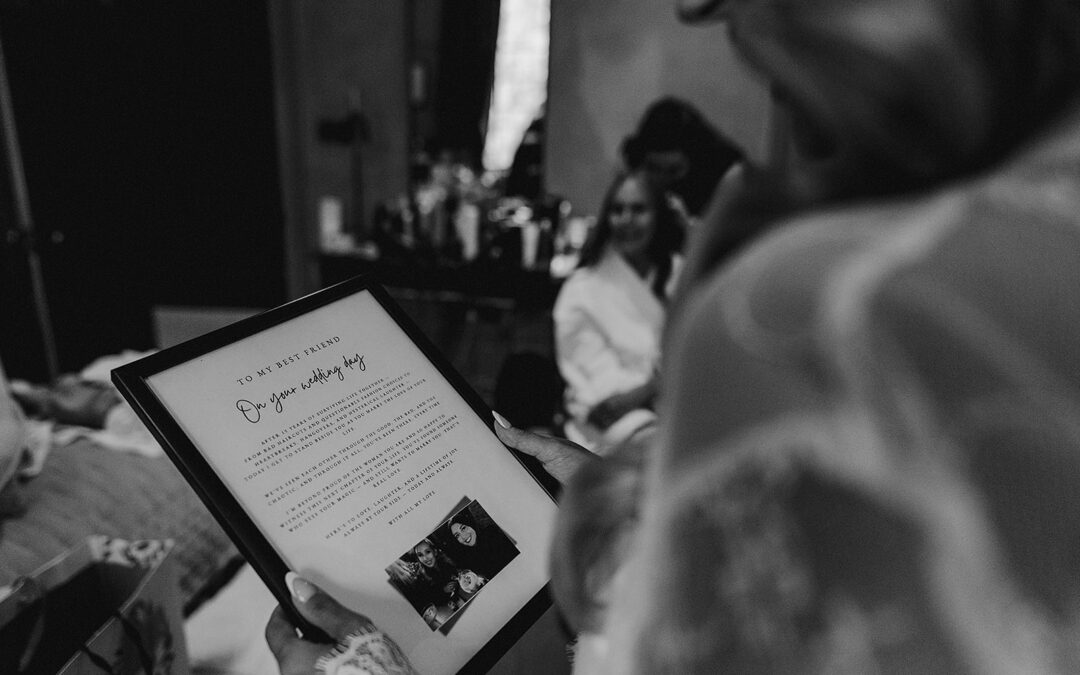 Candid photo of bride reading wedding card