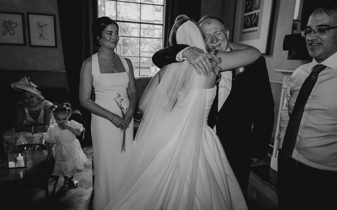 Candid documentary wedding photo of father of the bride hugging the bride at No 131 The Promenade