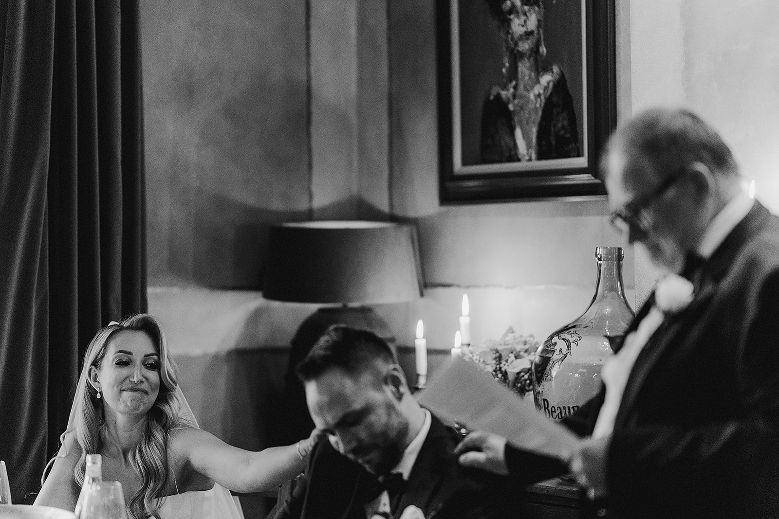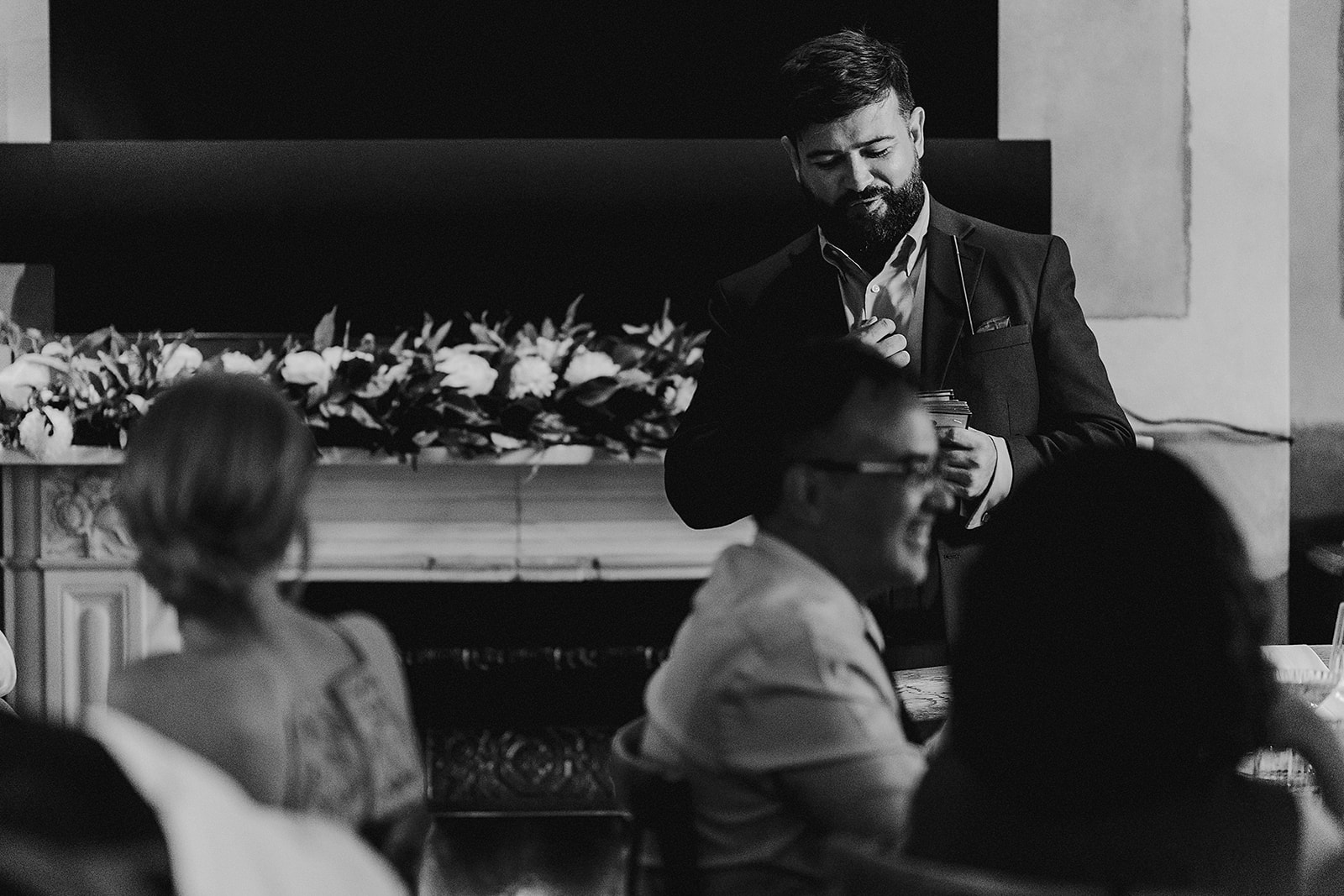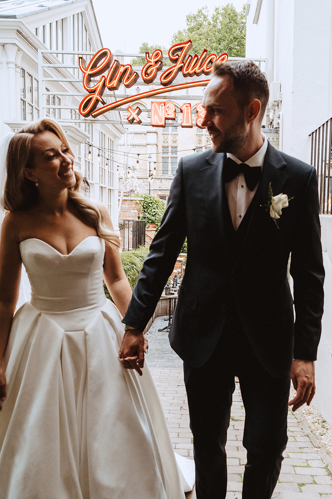 We managed to grab five minutes as the guests were going to find their seats to capture some quick portraits in front of the venue’s iconic Gin & Juice sign—a lovely, on-the-fly portrait spot! My 90/10 approach was in full swing: 90% unposed, real-time observation, giving Tara and Sam the space to simply be present and feel every moment, rather than perform for the camera.