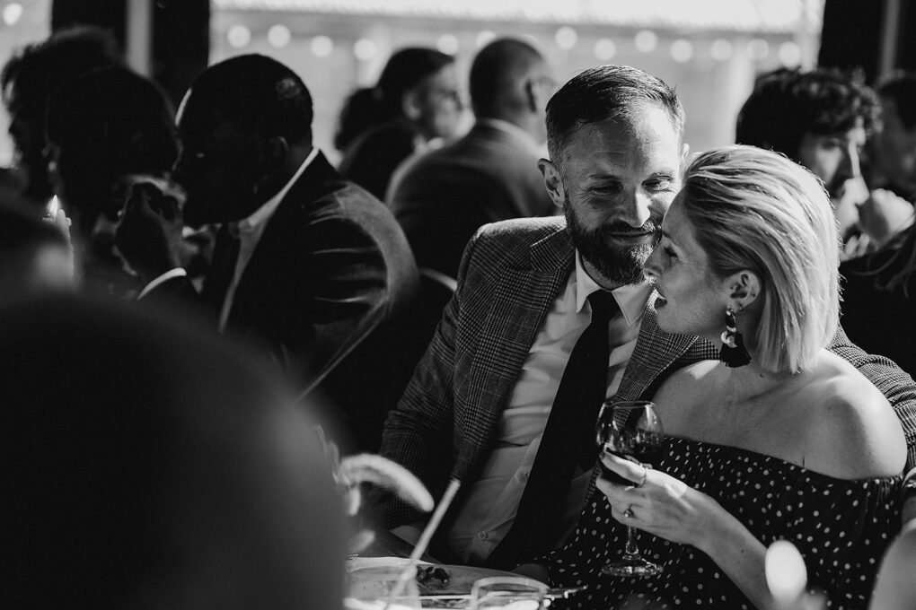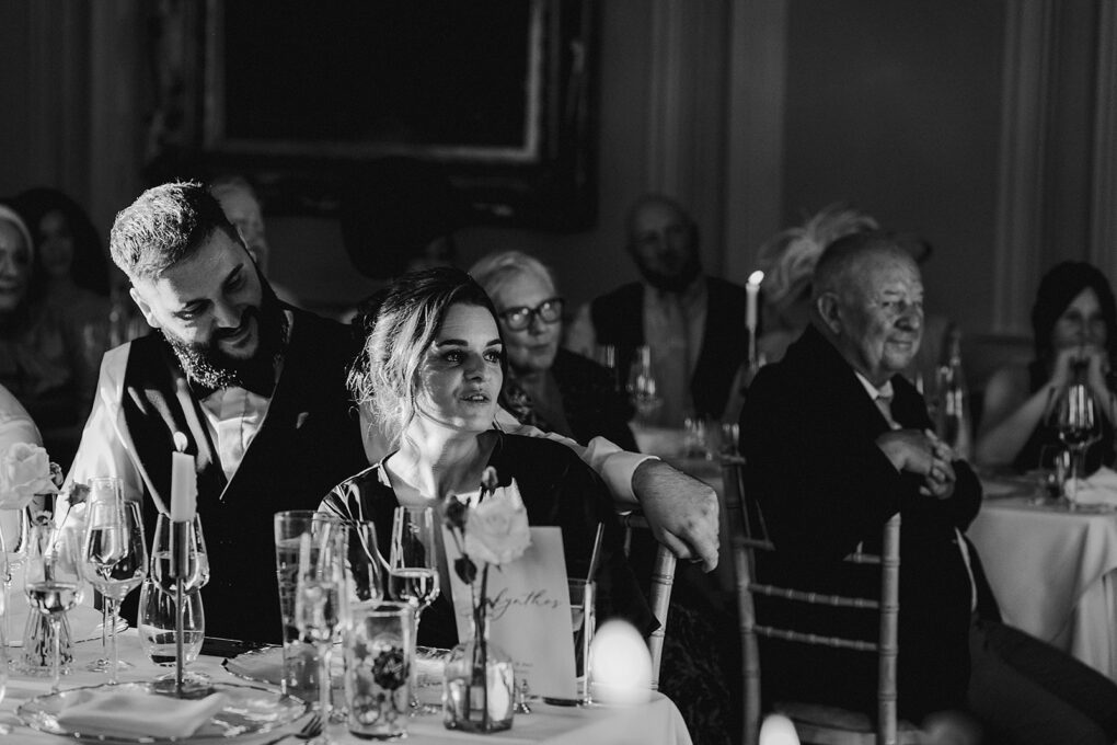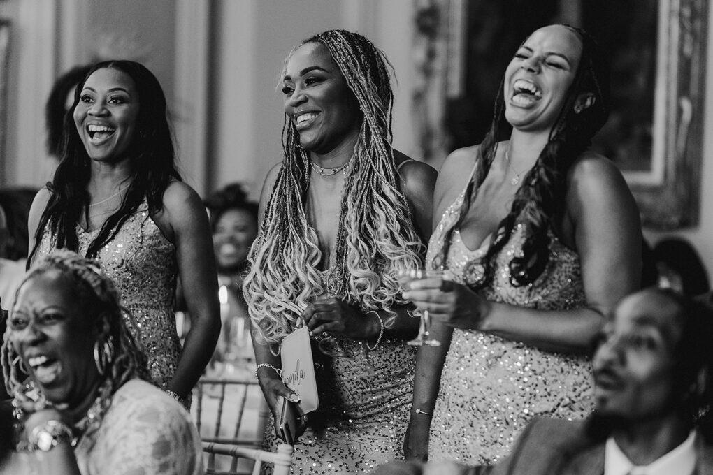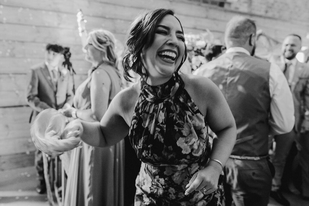 Black and white image of man and woman laughing during Wilde Lodge wedding reception